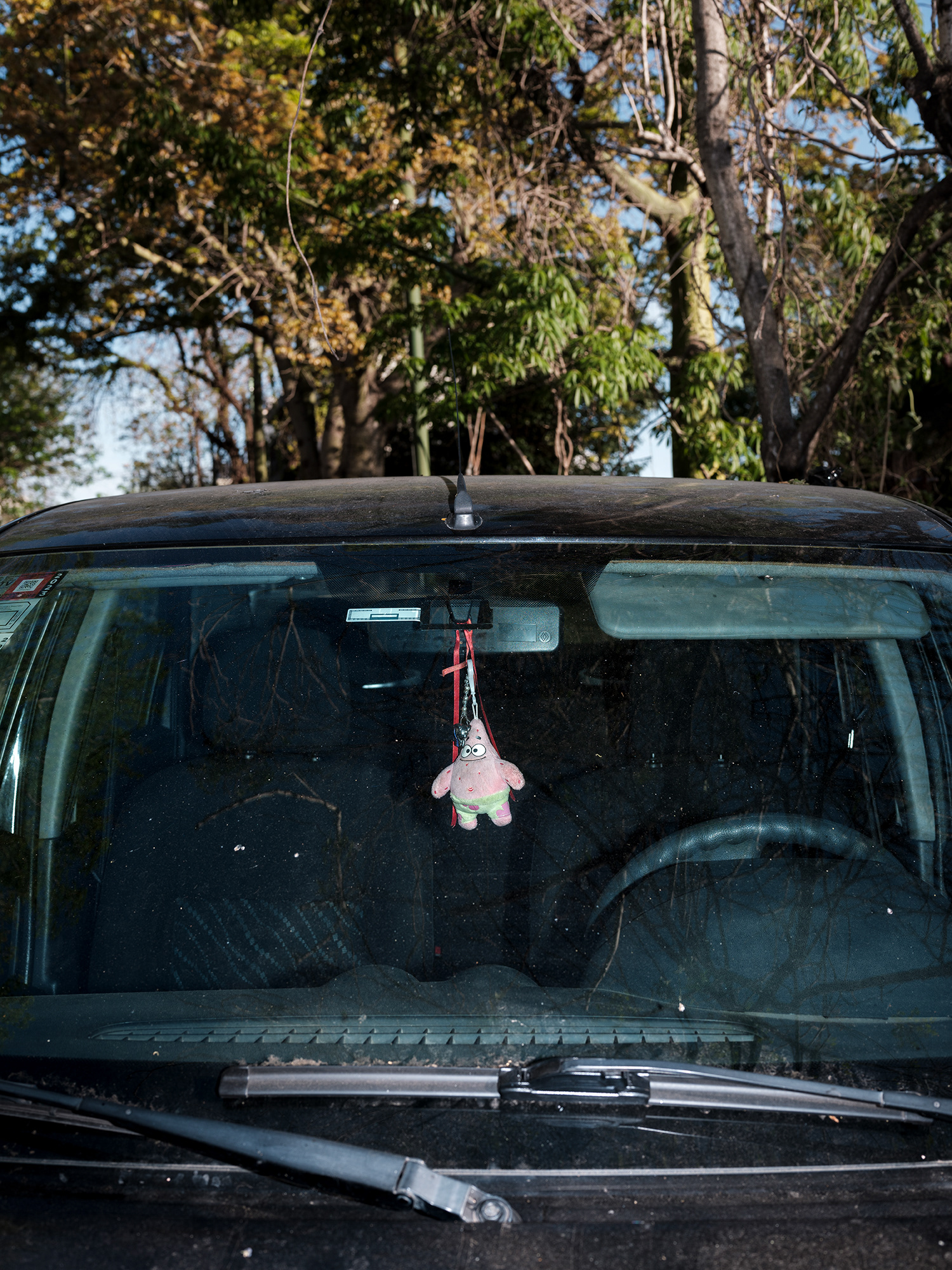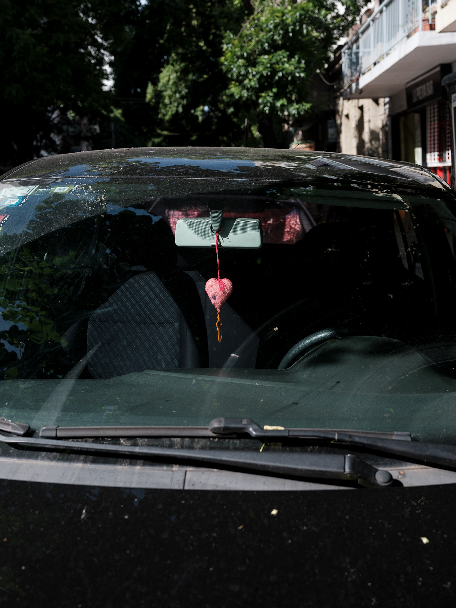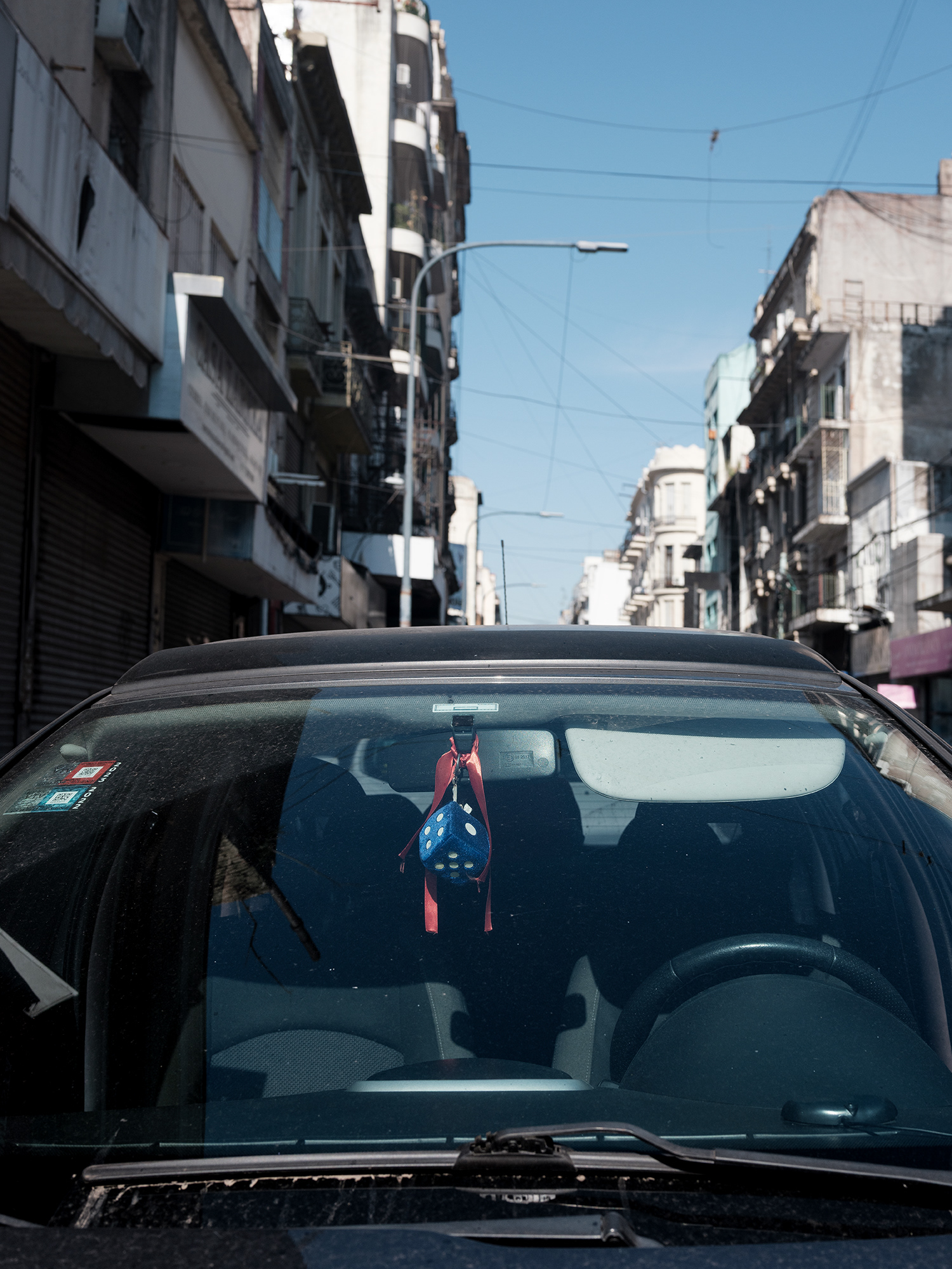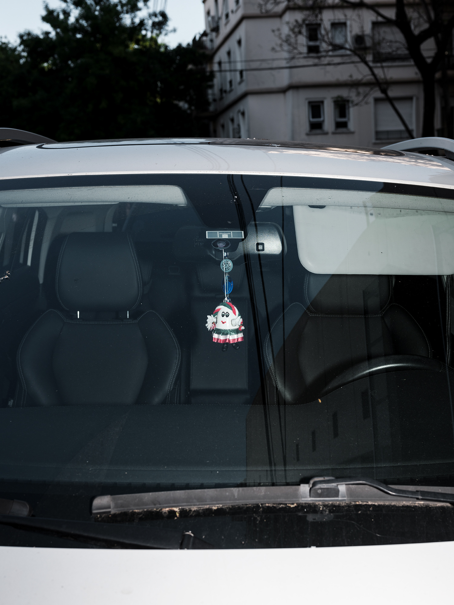 El automóvil –objeto funcional por excelencia del siglo XX y símbolo persistente de movilidad, estatus y pertenencia– se convierte en el escenario íntimo de un gesto profundamente humano: el de rodearse de objetos significativos. A través de tomas frontales, casi documentales, esta serie se enfoca en los colgantes que penden de los espejos retrovisores de los autos (o bien se encuentran apoyados sobre el tablero), objetos que, lejos de ser meros adornos, operan como amuletos, relicarios, ofrendas personales.