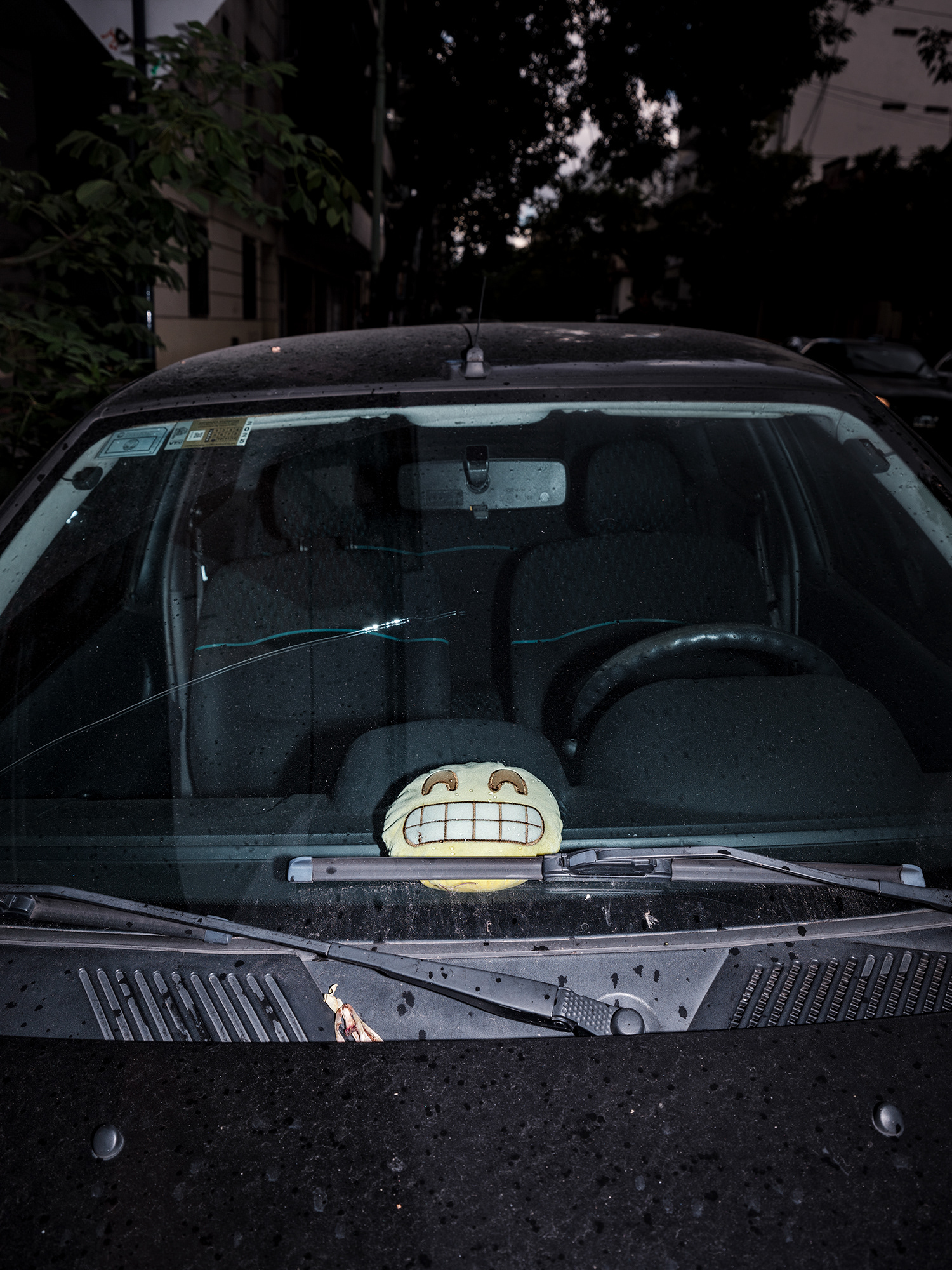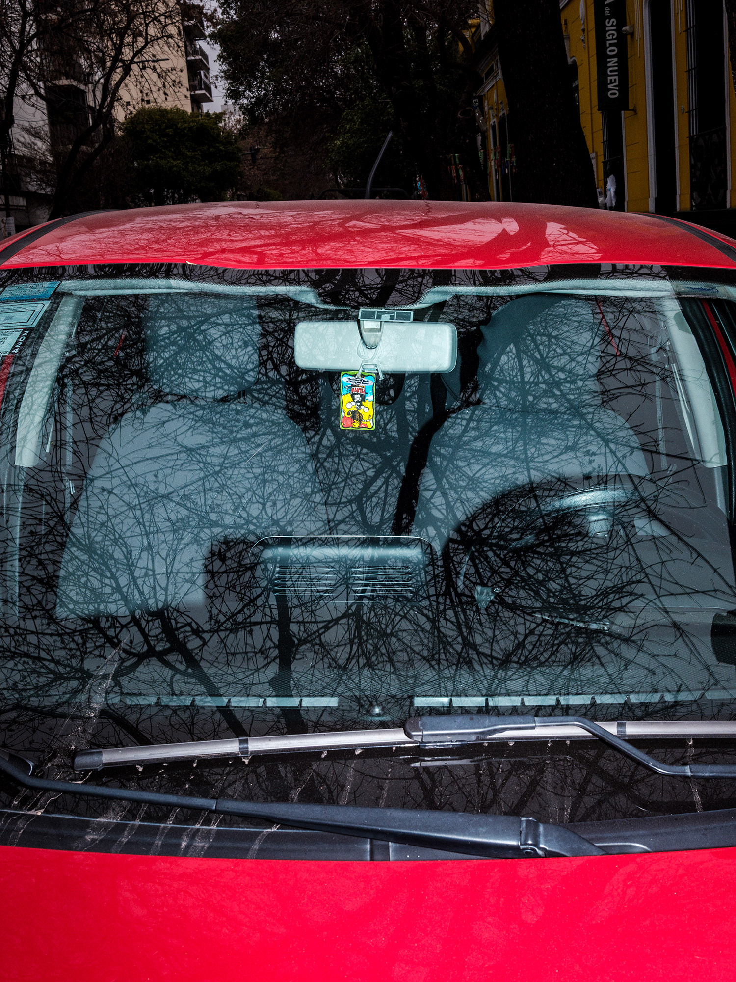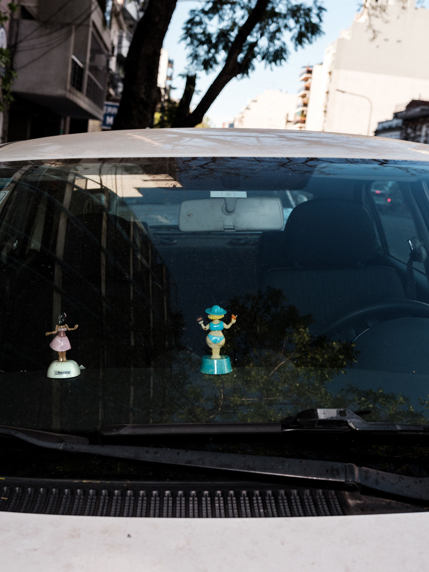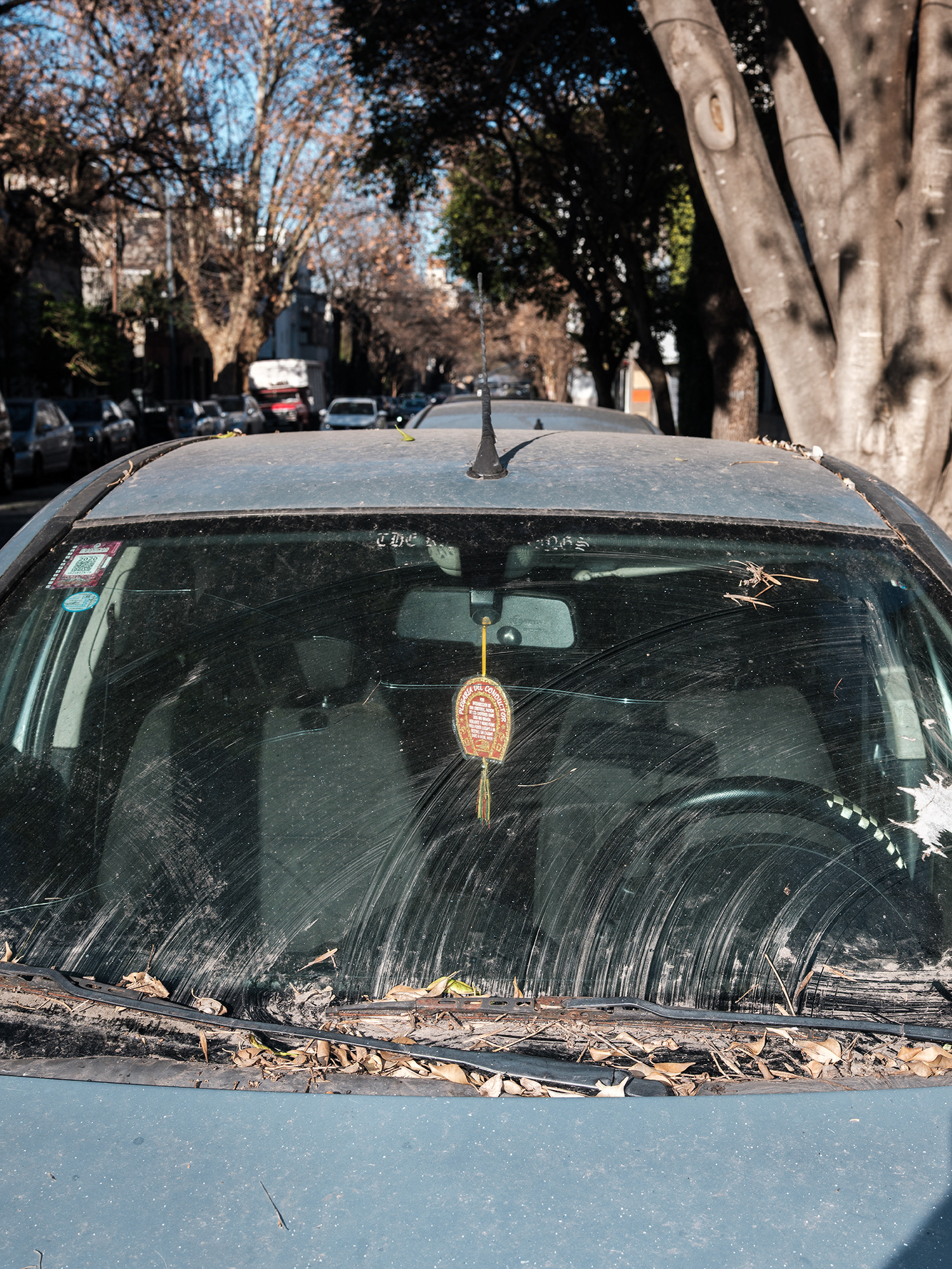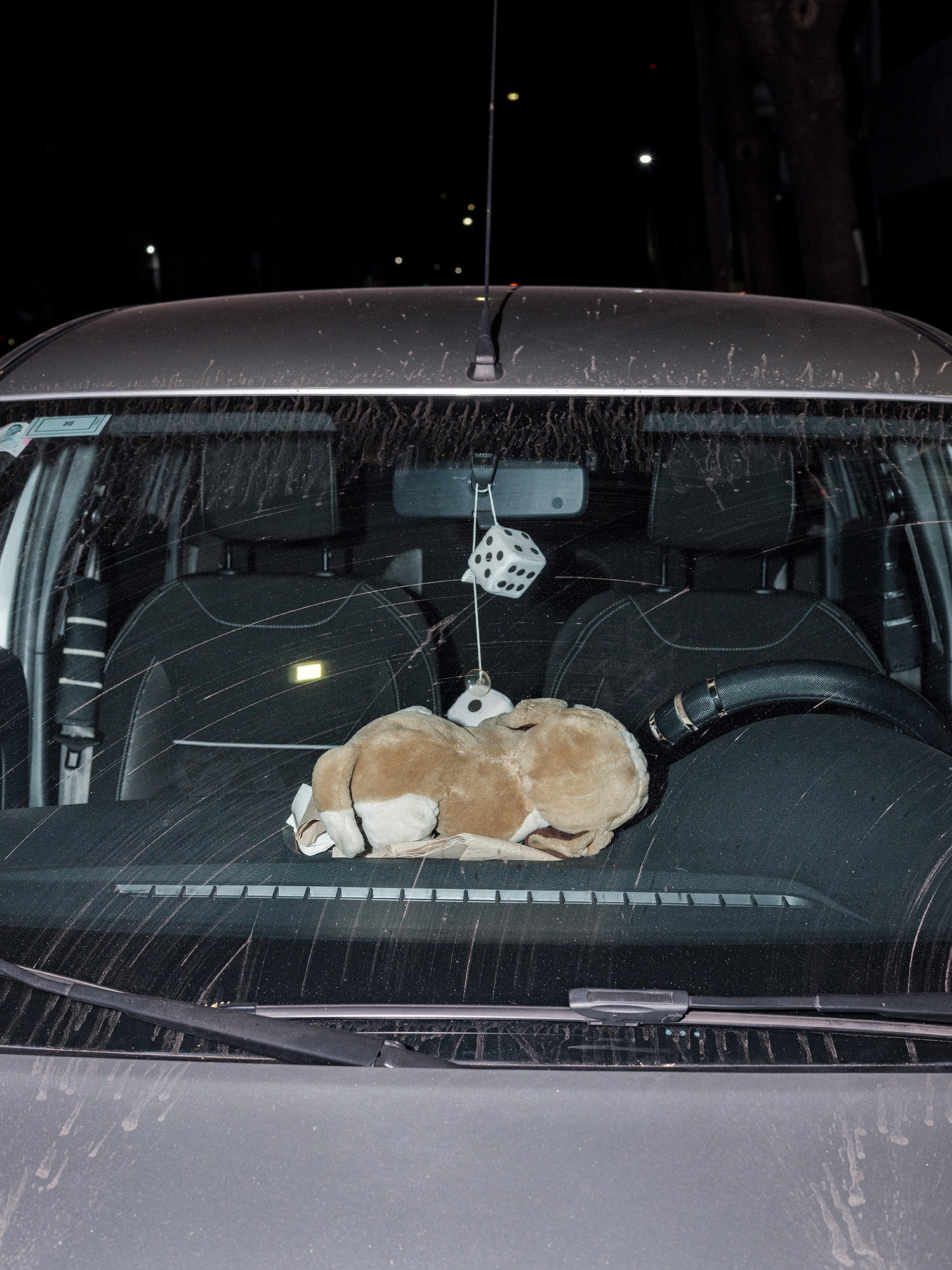 El automóvil –objeto funcional por excelencia del siglo XX y símbolo persistente de movilidad, estatus y pertenencia– se convierte en el escenario íntimo de un gesto profundamente humano: el de rodearse de objetos significativos. A través de tomas frontales, casi documentales, esta serie se enfoca en los colgantes que penden de los espejos retrovisores de los autos (o bien se encuentran apoyados sobre el tablero), objetos que, lejos de ser meros adornos, operan como amuletos, relicarios, ofrendas personales.