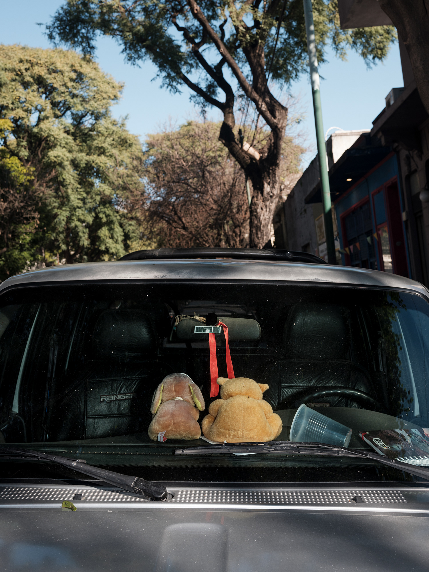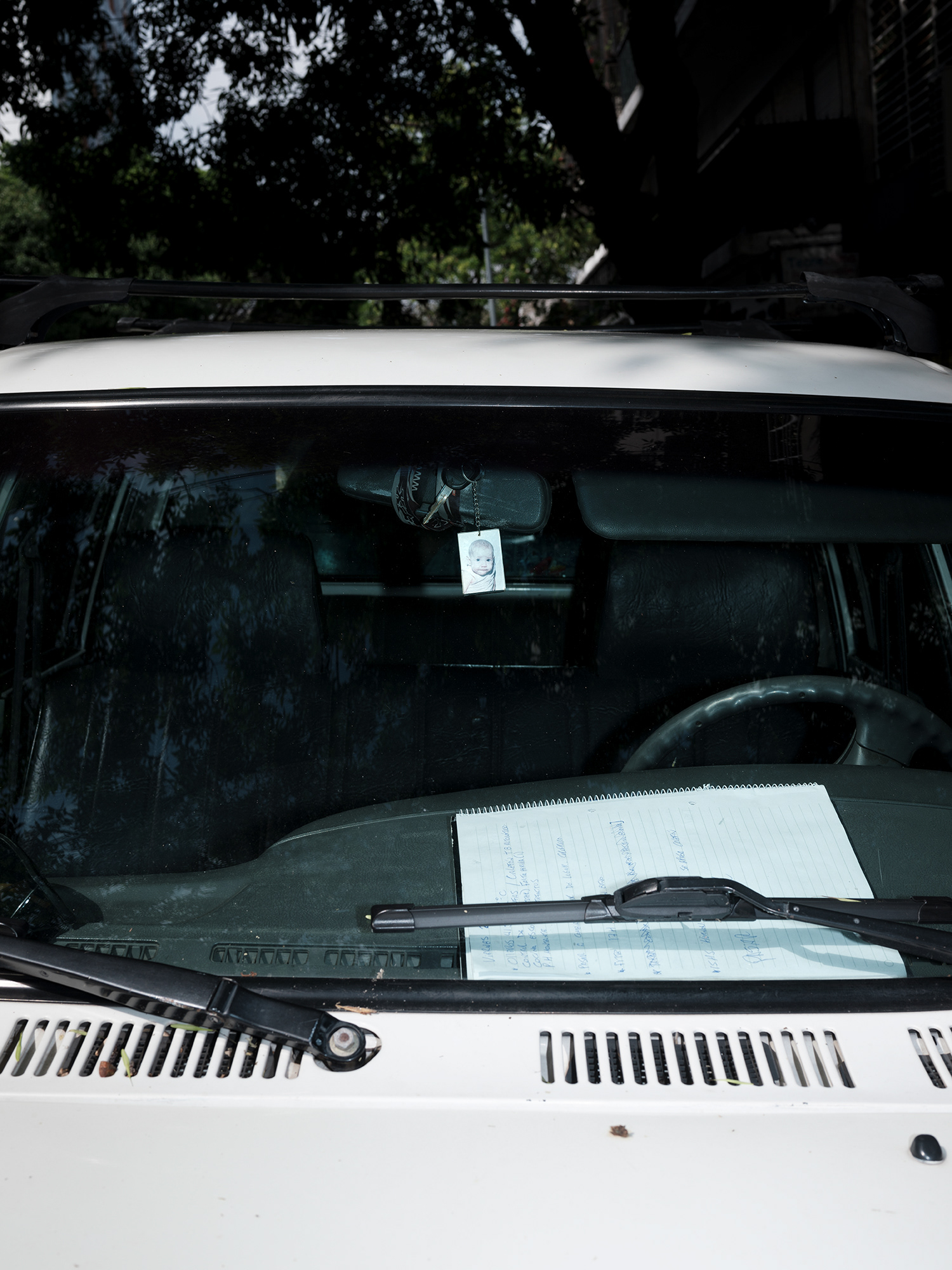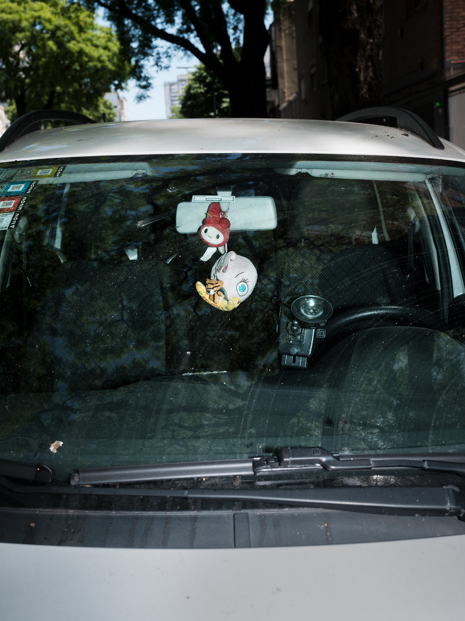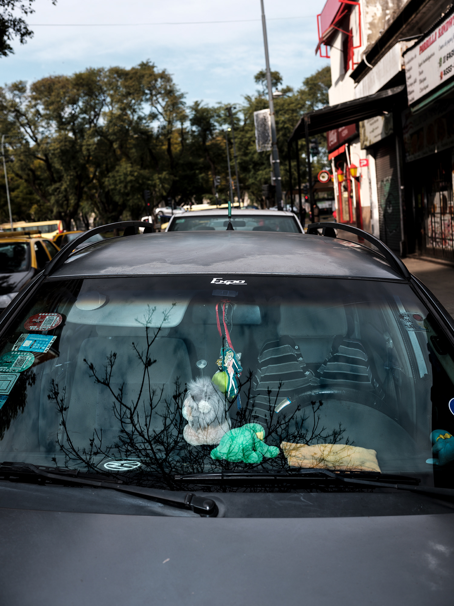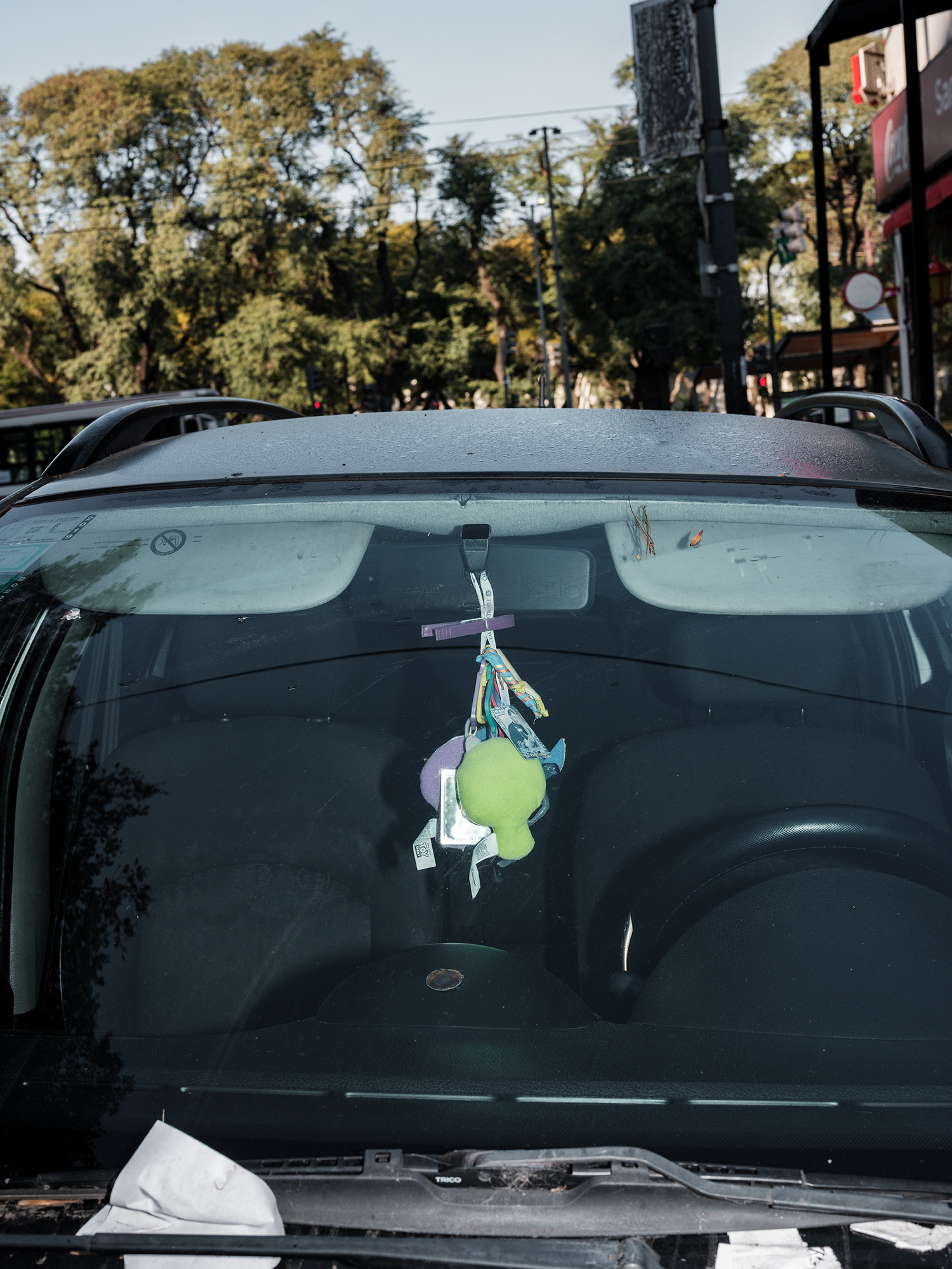 Peluches, zapatitos de bebé, estampitas, rosarios, banderas, llaveros y fotografías cuelgan como talismanes frente al parabrisas, enfrentando el camino, protegiendo y acompañando. Cada imagen abre una puerta hacia una narrativa invisible pero latente: la del amor por un hijo, la fe como resguardo, la memoria de alguien que no está, o la afirmación de una identidad. Son pequeños altares móviles, desplazándose por la ciudad, encapsulados en la cápsula de lo cotidiano.