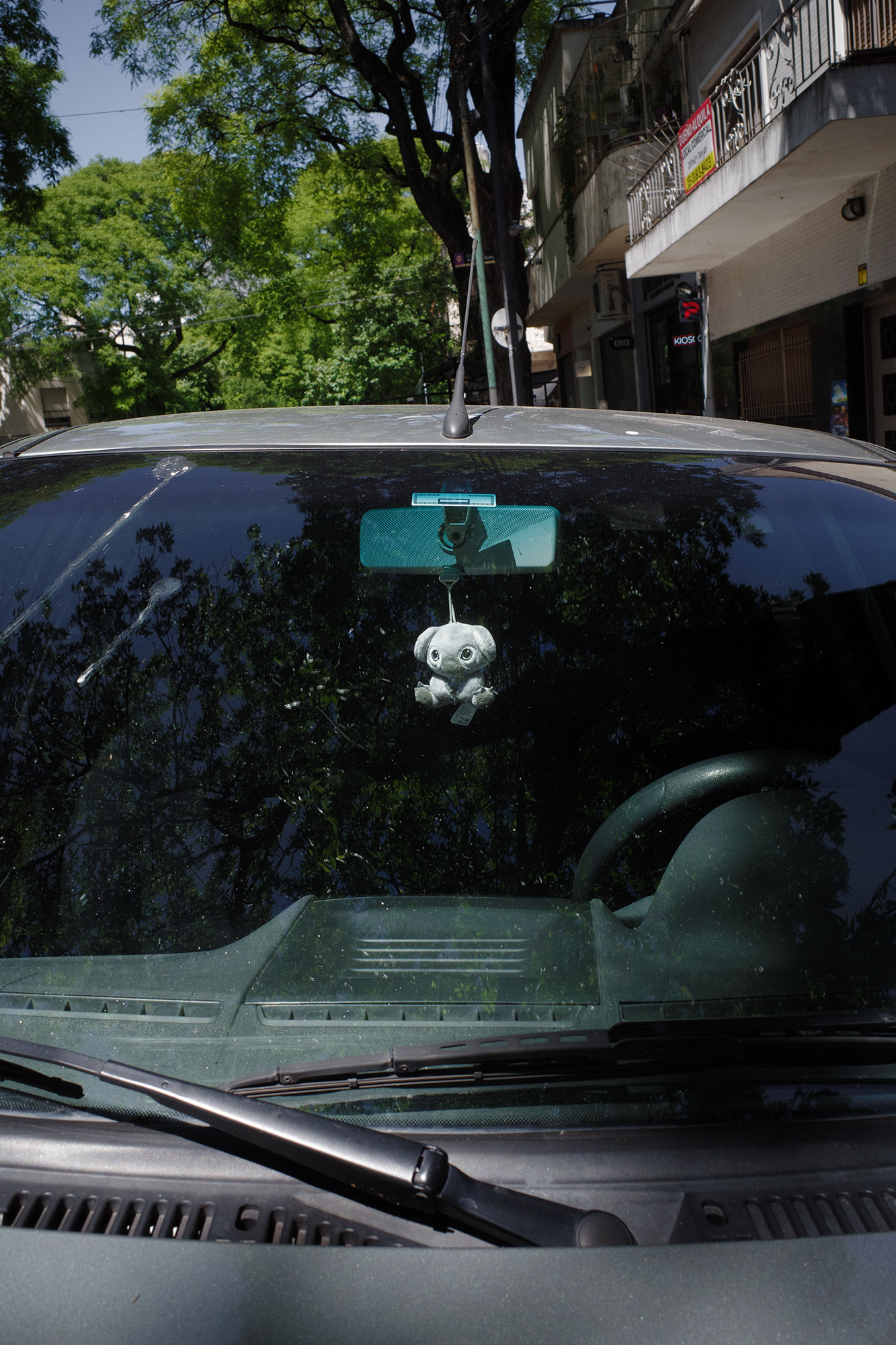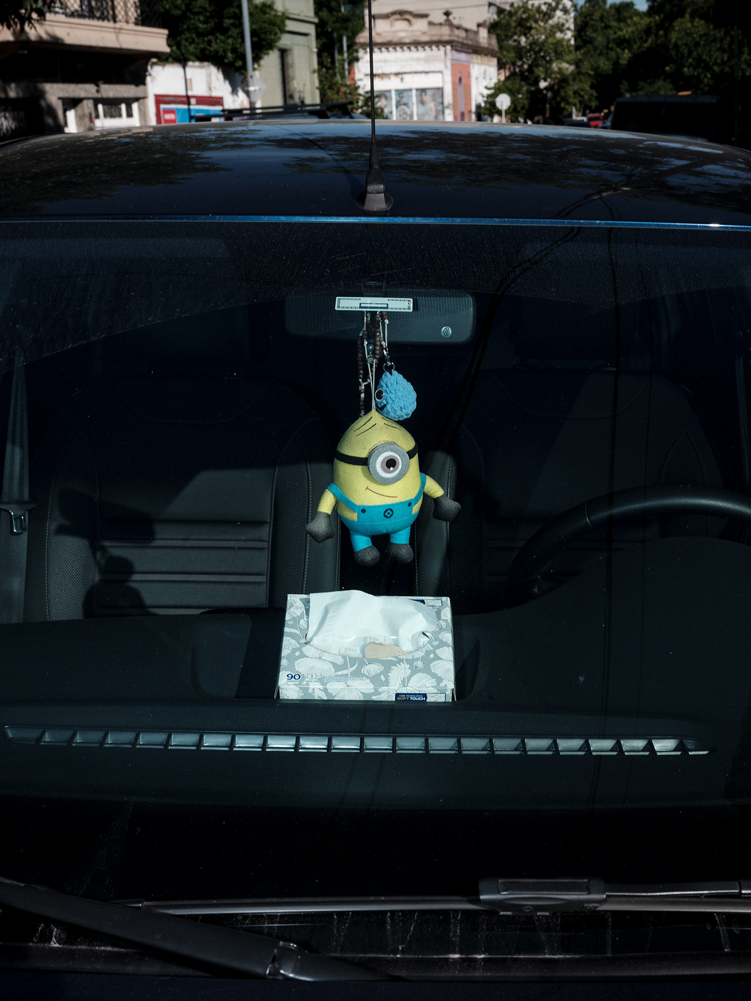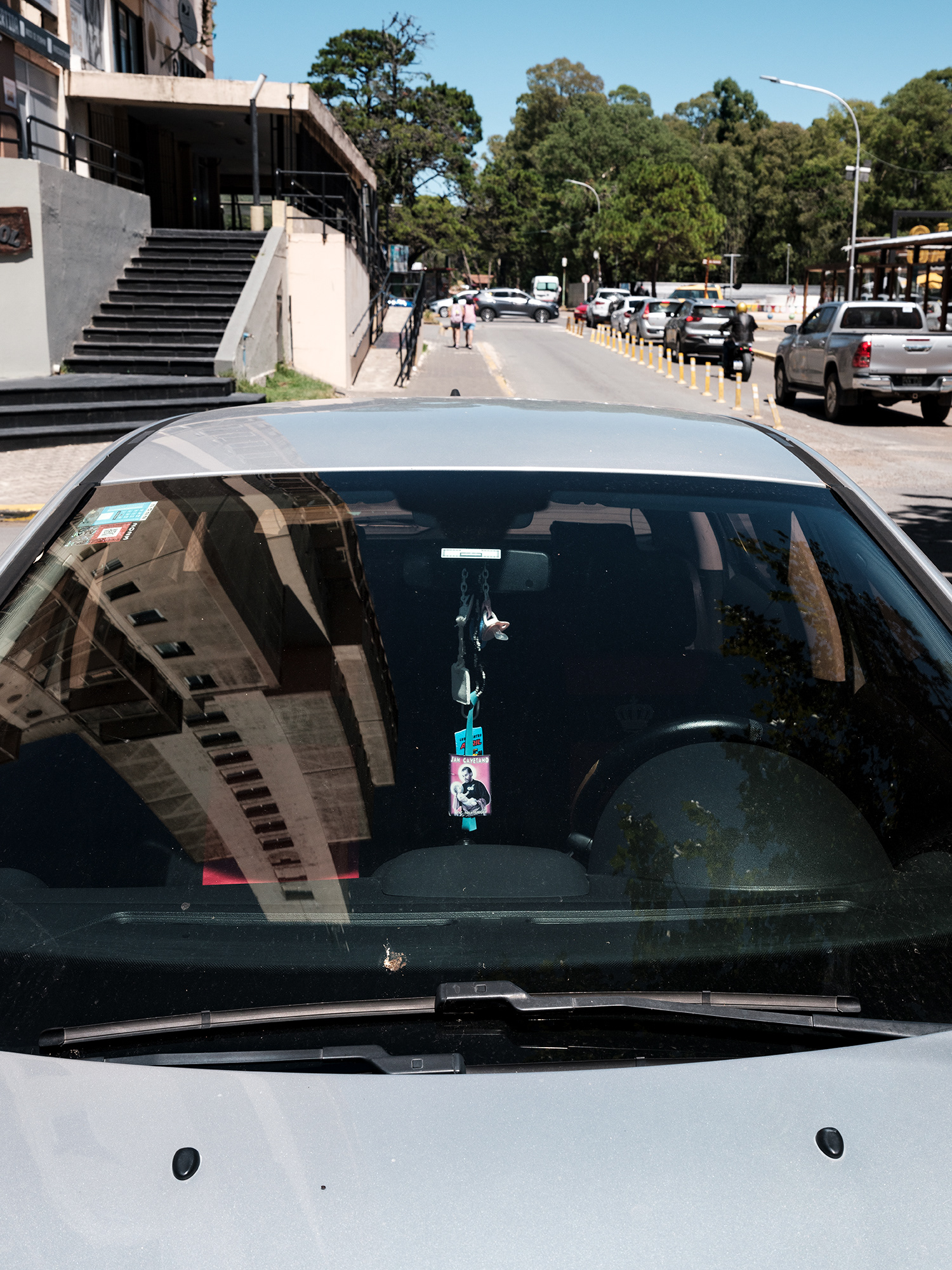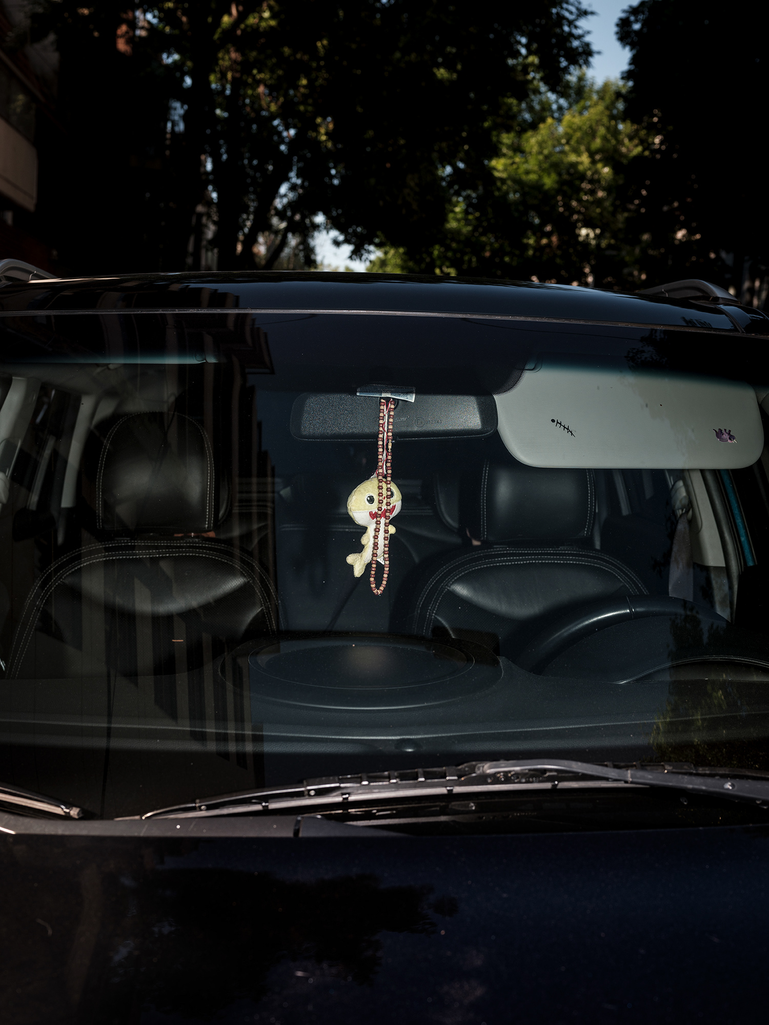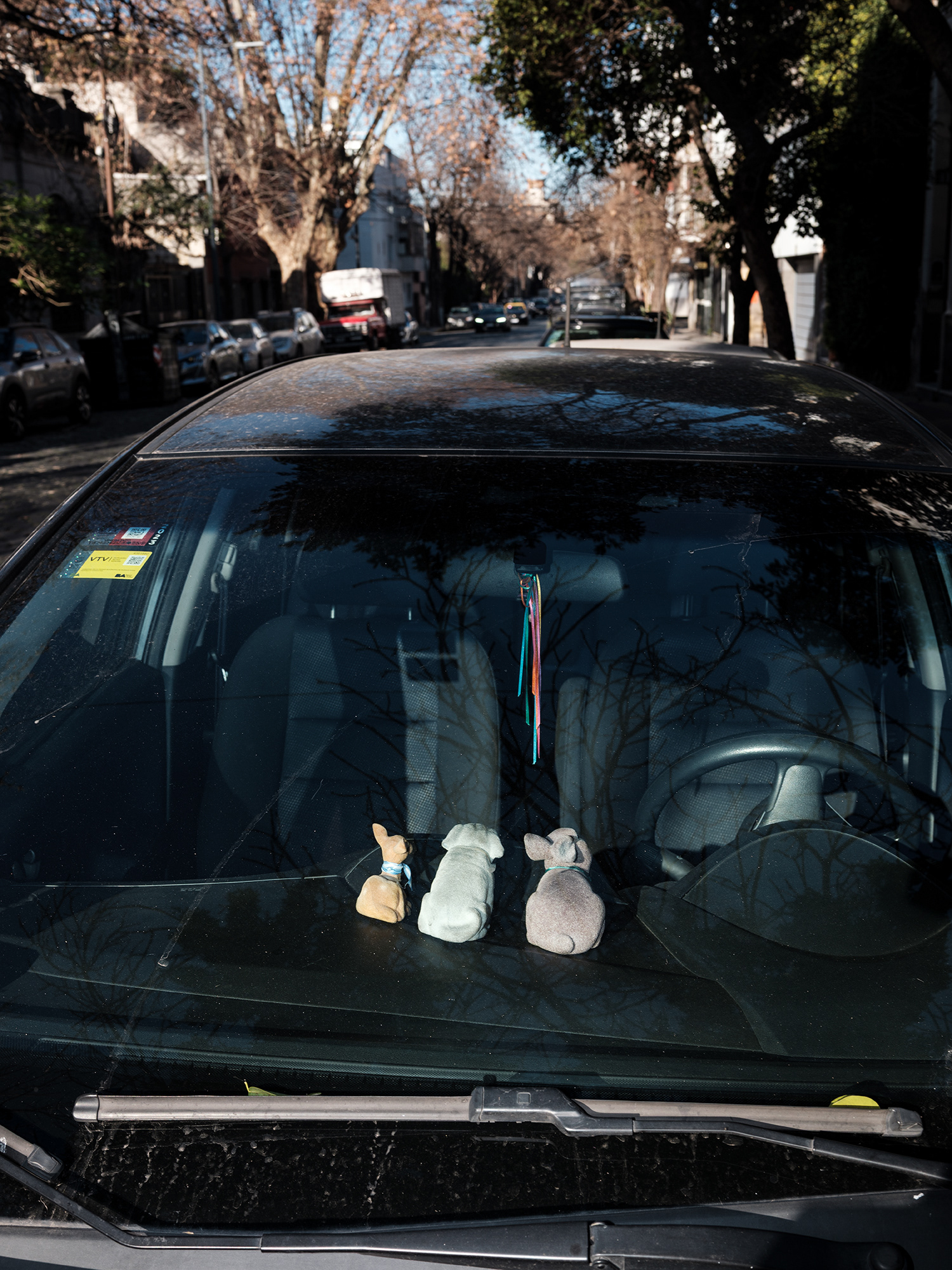 Peluches, zapatitos de bebé, estampitas, rosarios, banderas, llaveros y fotografías cuelgan como talismanes frente al parabrisas, enfrentando el camino, protegiendo y acompañando. Cada imagen abre una puerta hacia una narrativa invisible pero latente: la del amor por un hijo, la fe como resguardo, la memoria de alguien que no está, o la afirmación de una identidad. Son pequeños altares móviles, desplazándose por la ciudad, encapsulados en la cápsula de lo cotidiano.