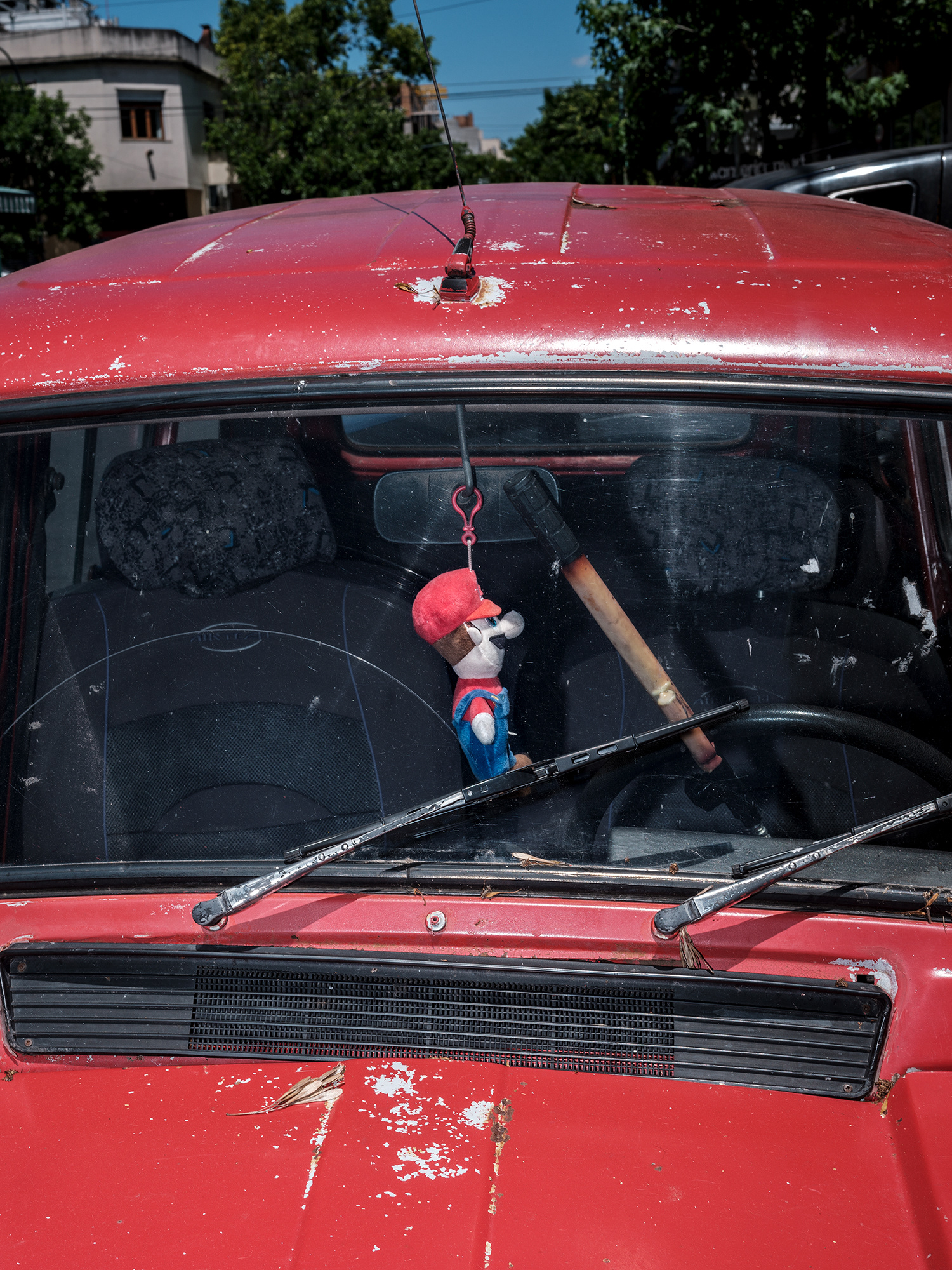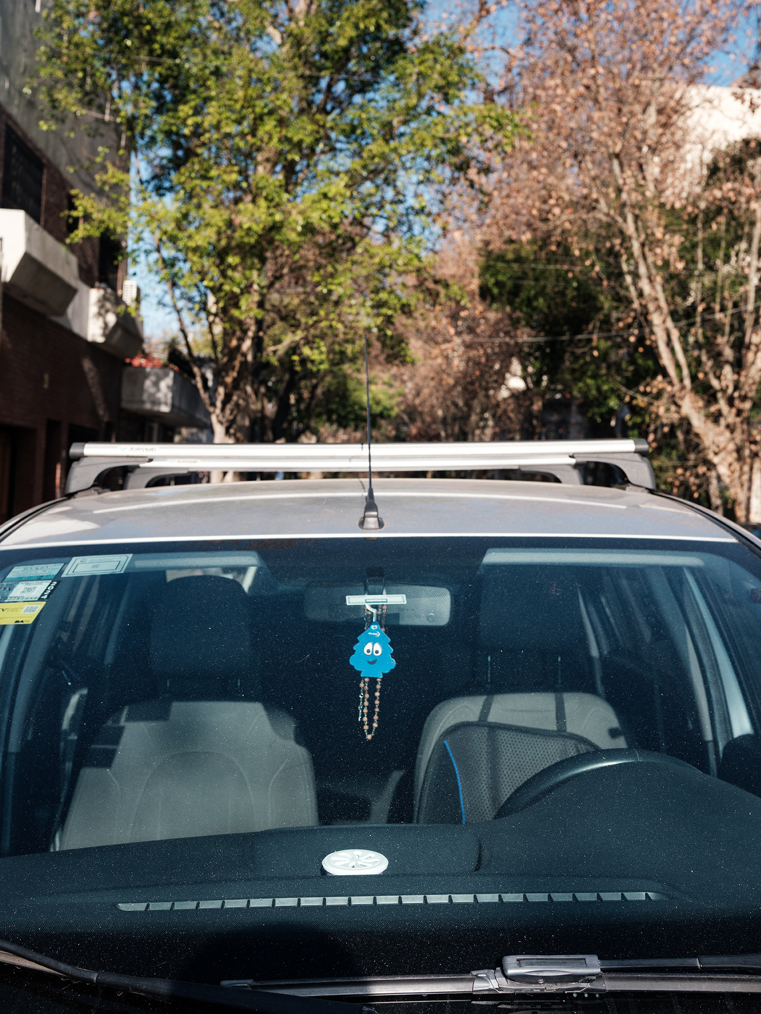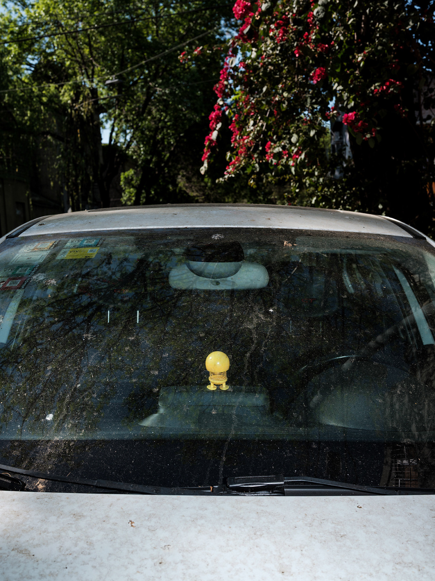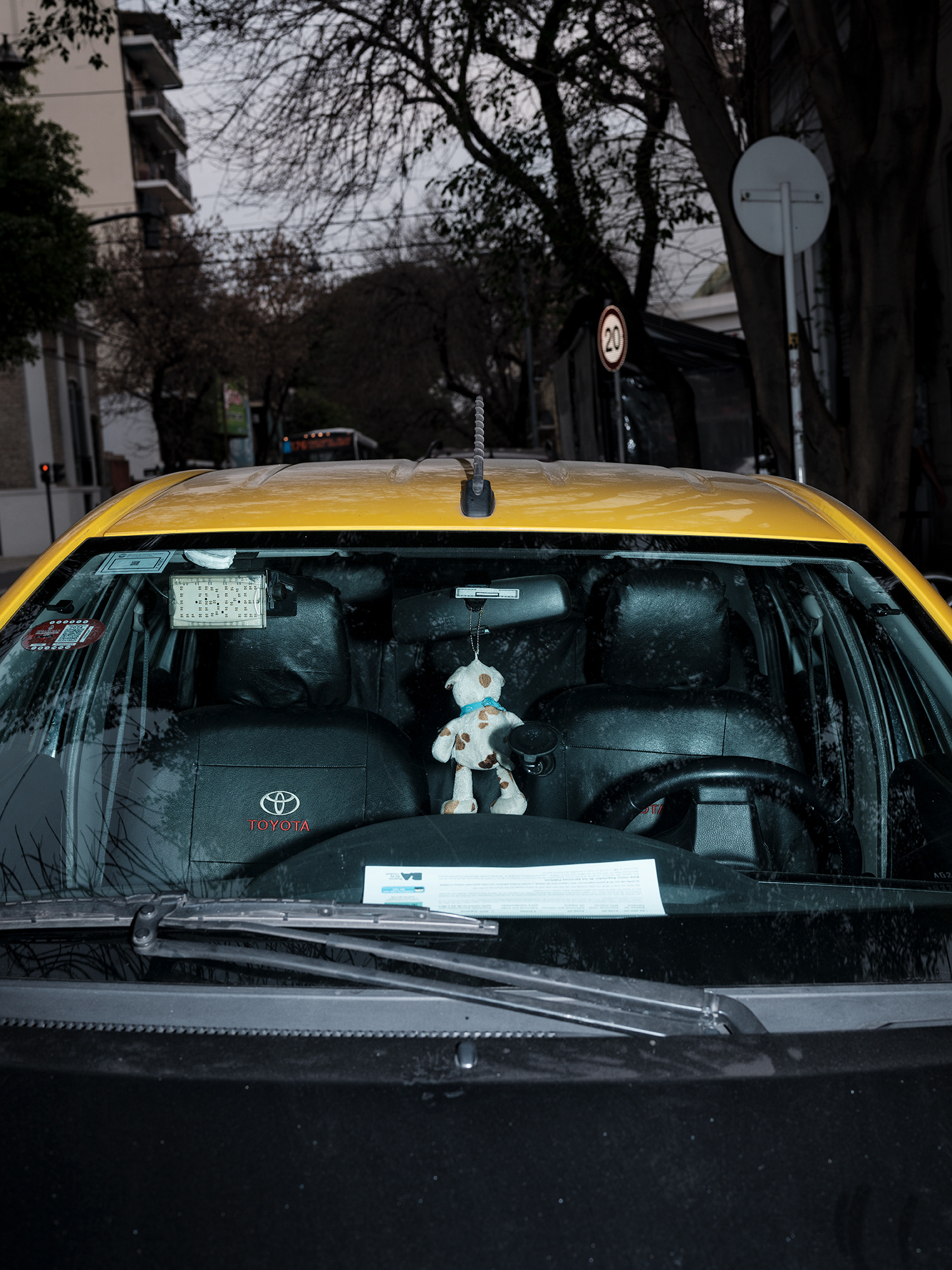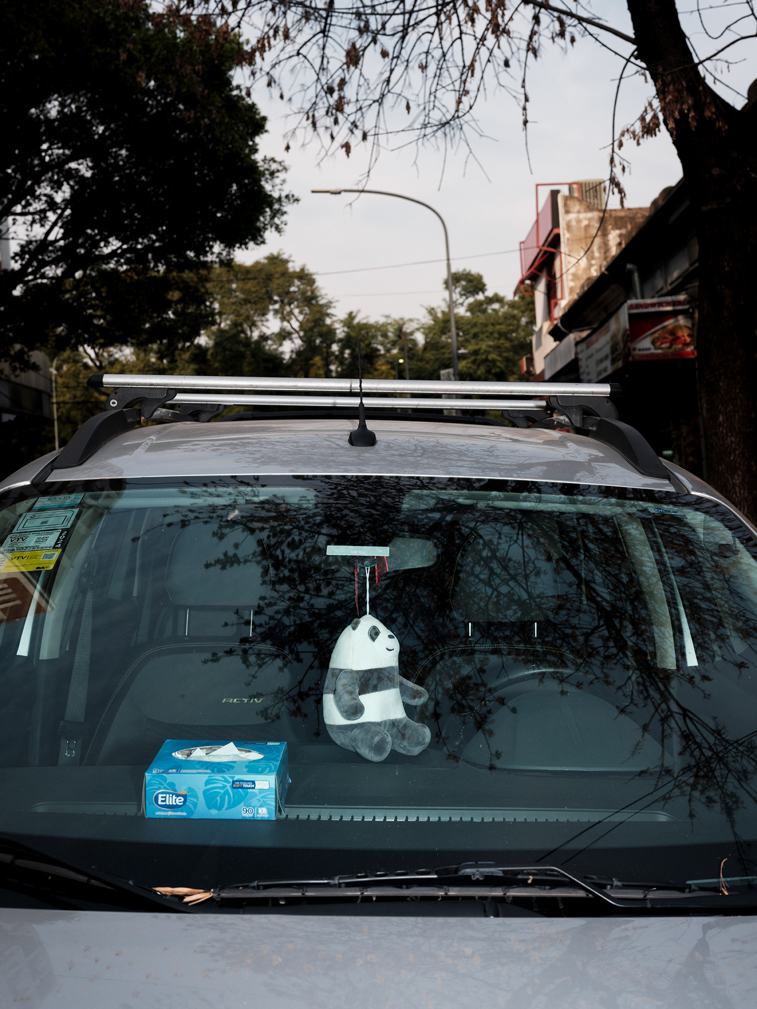 Peluches, zapatitos de bebé, estampitas, rosarios, banderas, llaveros y fotografías cuelgan como talismanes frente al parabrisas, enfrentando el camino, protegiendo y acompañando. Cada imagen abre una puerta hacia una narrativa invisible pero latente: la del amor por un hijo, la fe como resguardo, la memoria de alguien que no está, o la afirmación de una identidad. Son pequeños altares móviles, desplazándose por la ciudad, encapsulados en la cápsula de lo cotidiano.